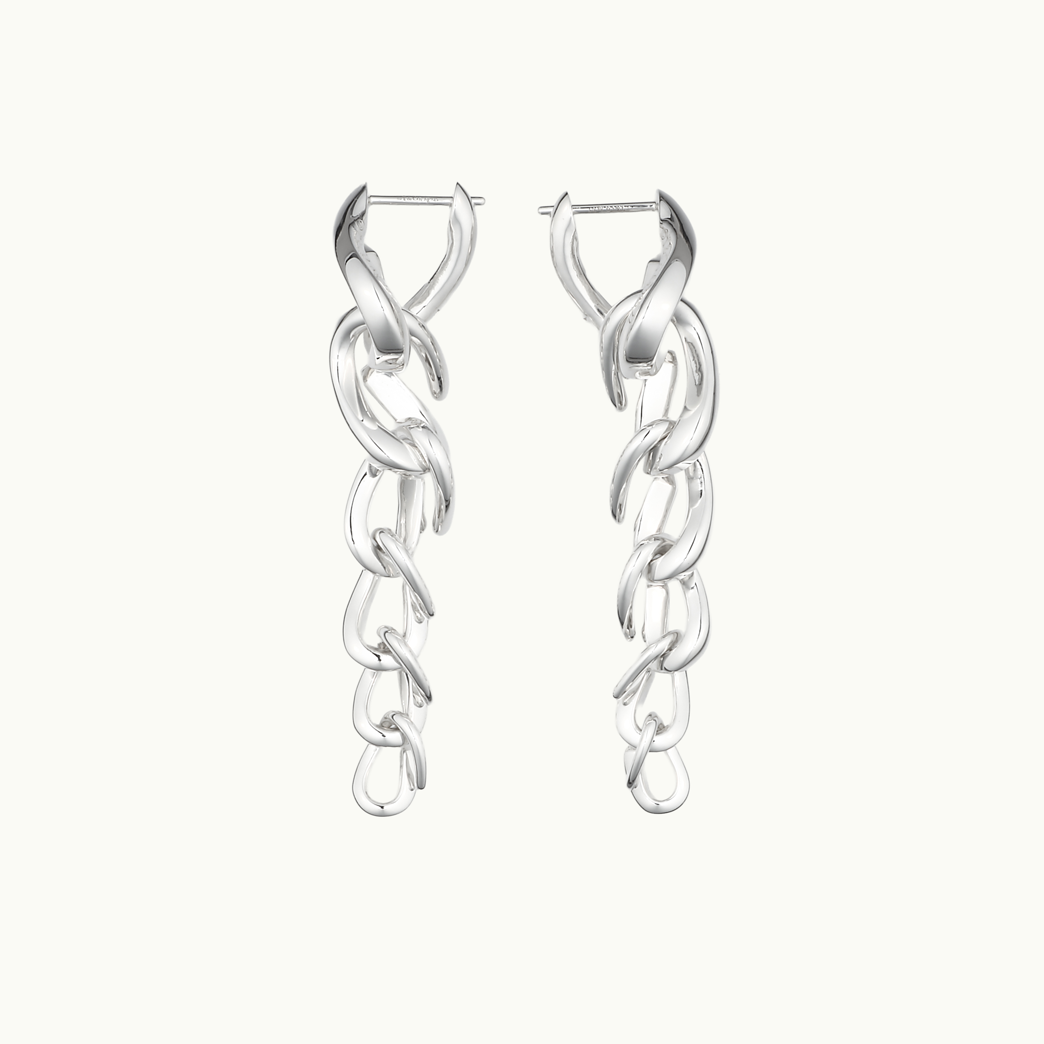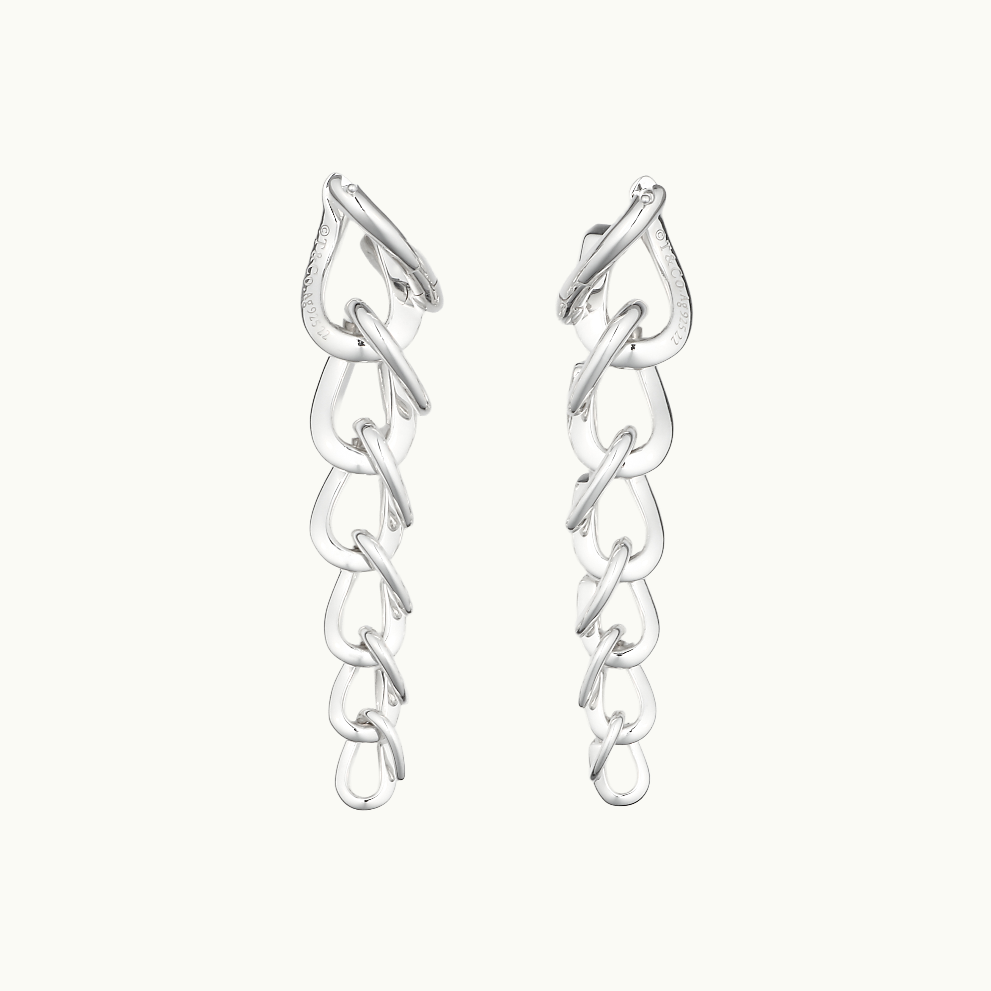 「フォージ ドロップ リンク ピアス」は、そのシグネチャーであるオープンリンクを縦に連ねたドロップタイプのモデル。磨き上げられたリンクが耳もとでゆるやかに揺れ、動くたびに光を受けて表情を変えます。しっかりとしたボリューム感がありながら、縦にストンと落ちるシルエットのおかげで、顔まわりをすっきり見せてくれるのも魅力です。