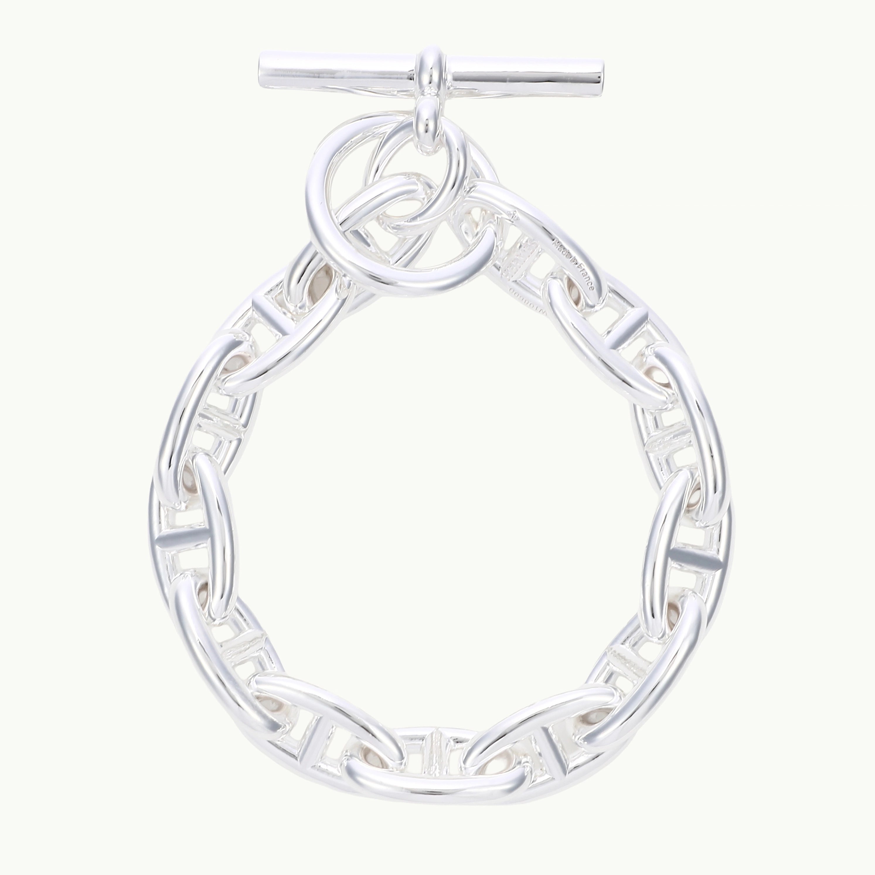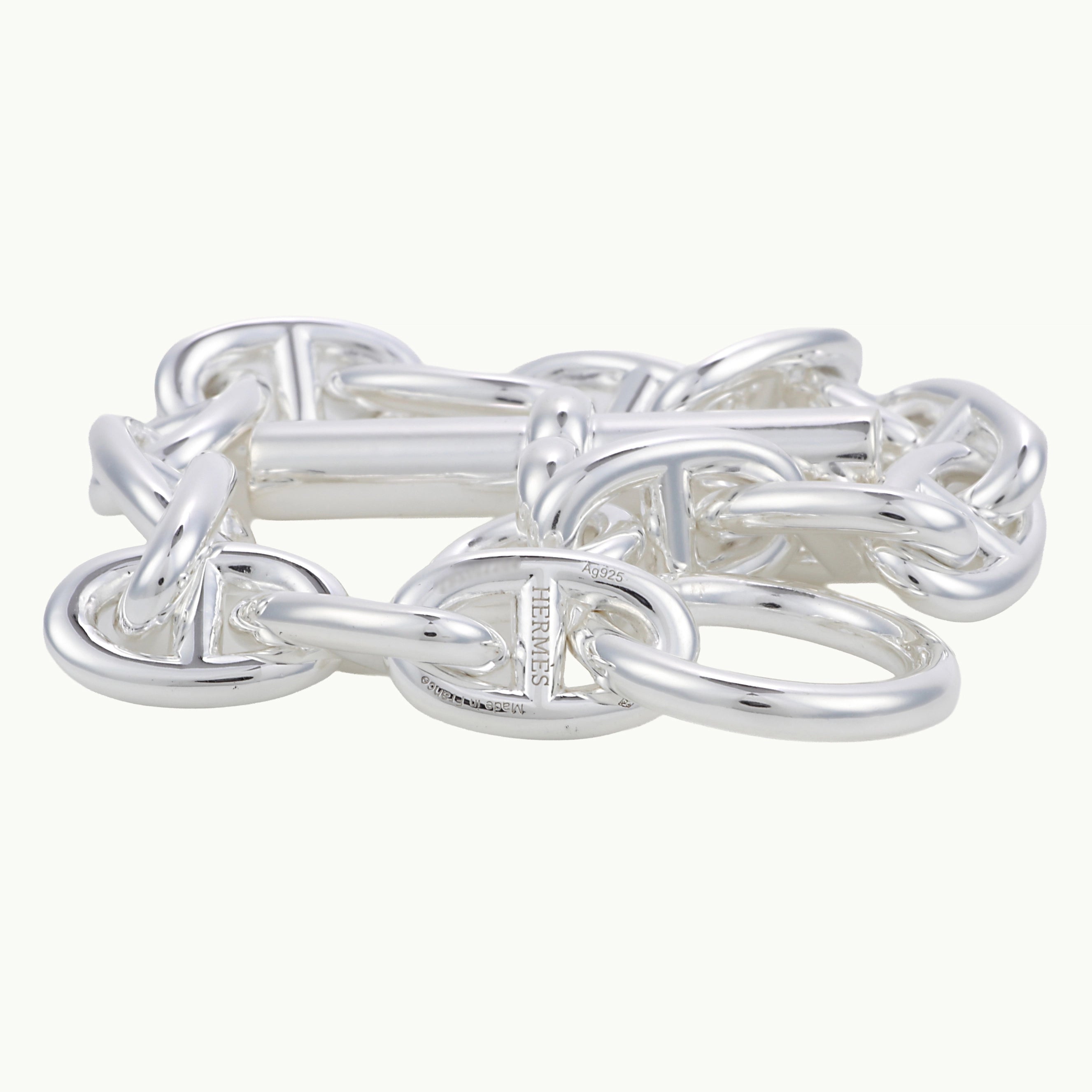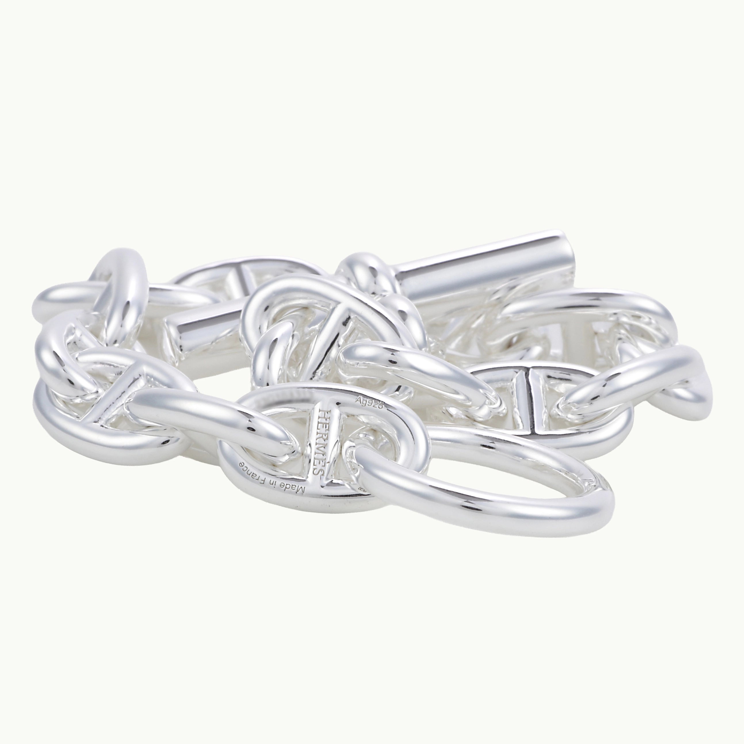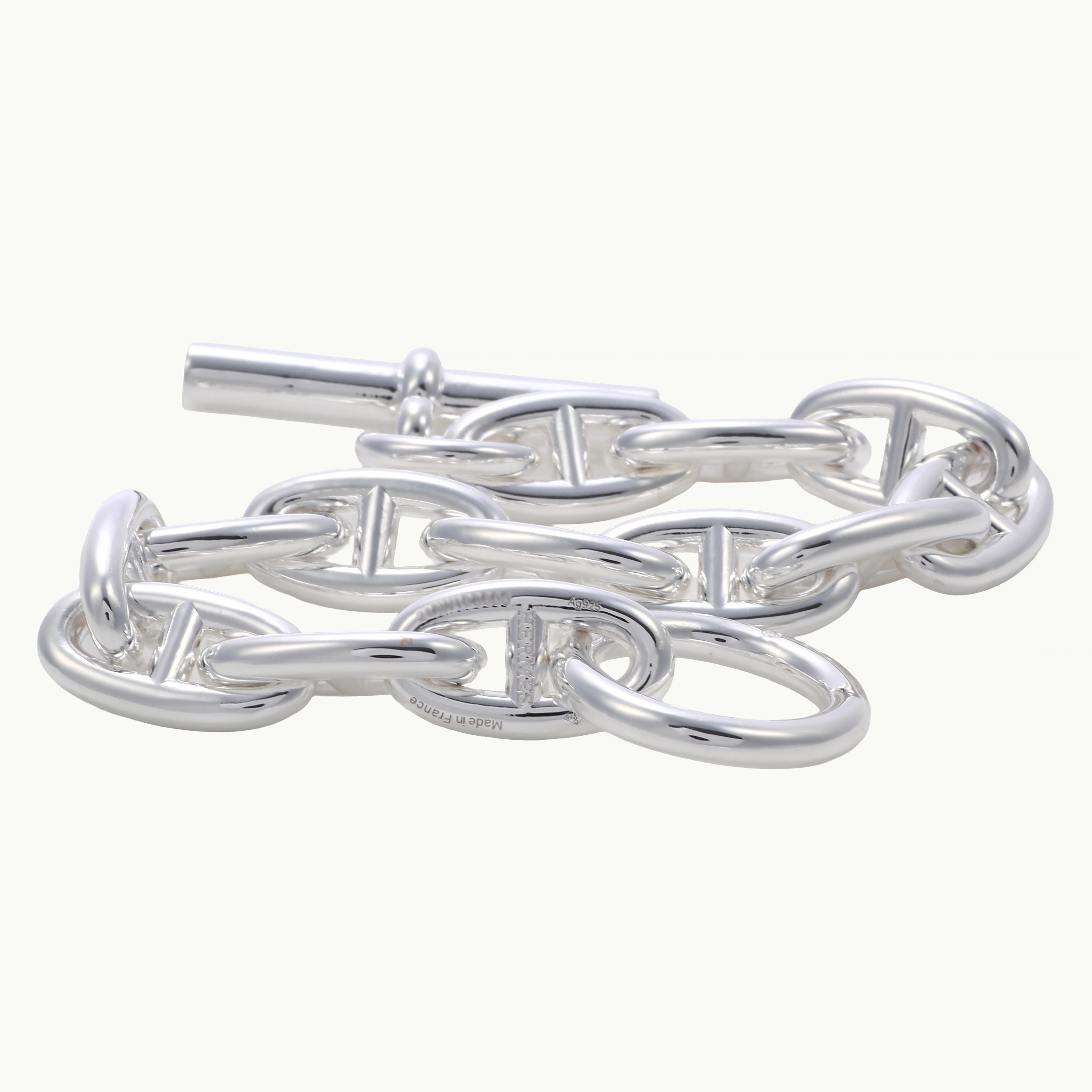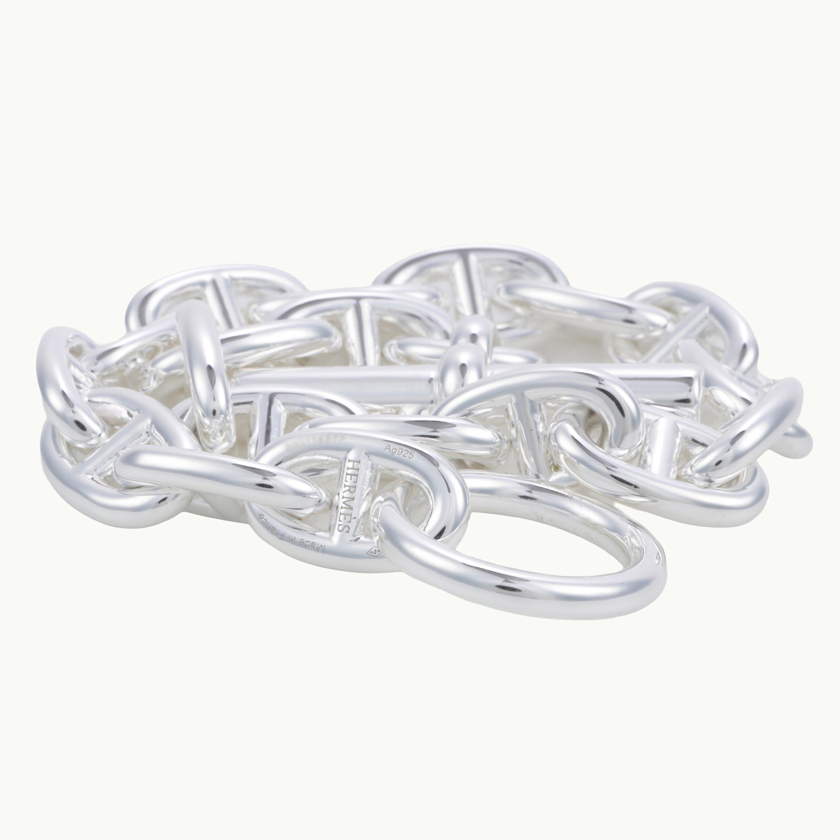 本品はそのシリーズの中でも2番目に小さい「PMサイズ」。華奢すぎず、程よいボリューム感で、ジェンダーを問わず着用できる絶妙なバランスが魅力です。エルメスが誇る職人の手仕事により、各リンクが美しく繋がれたチェーンは、静かな中にも確かな存在感を放ち、シンプルな装いを格上げしてくれます。