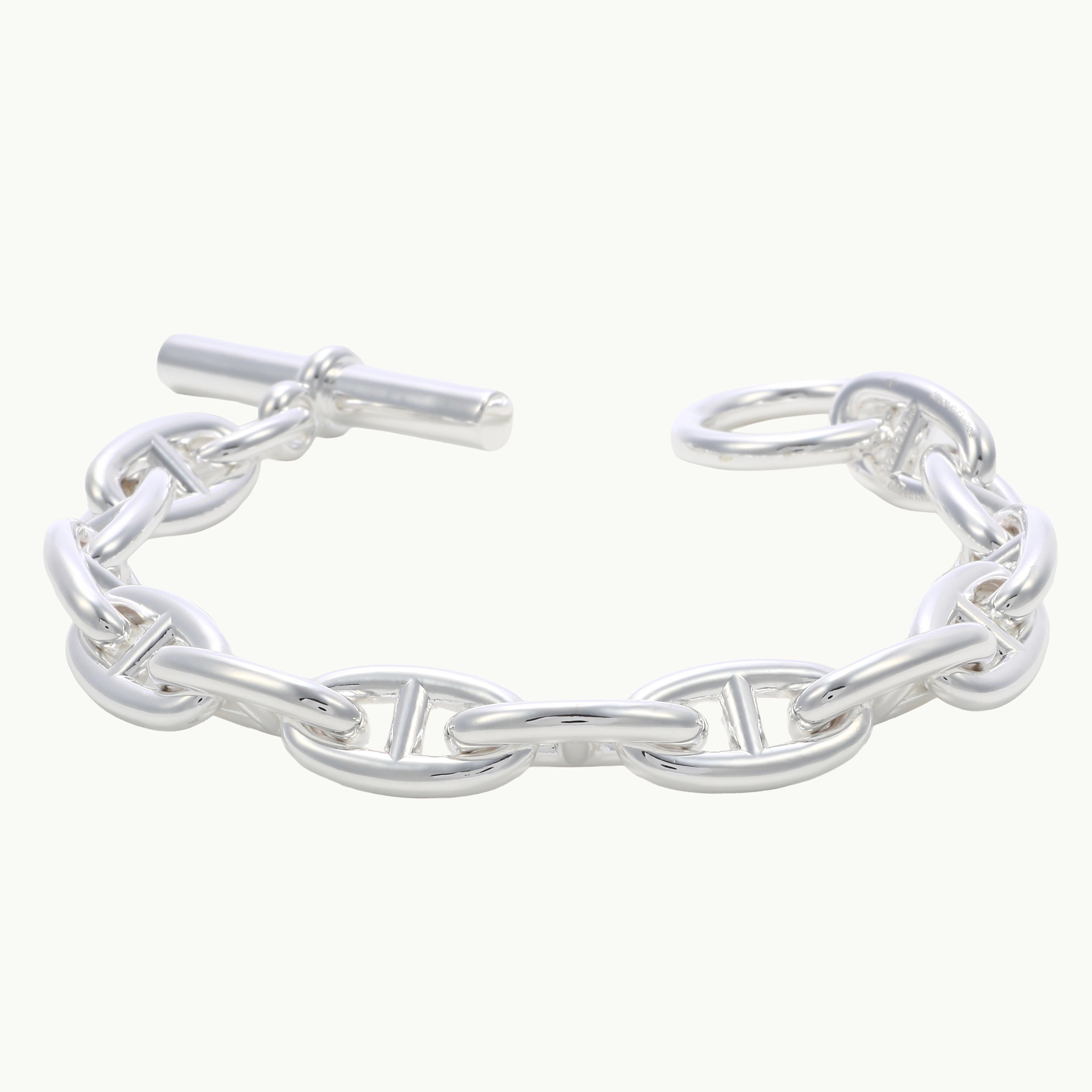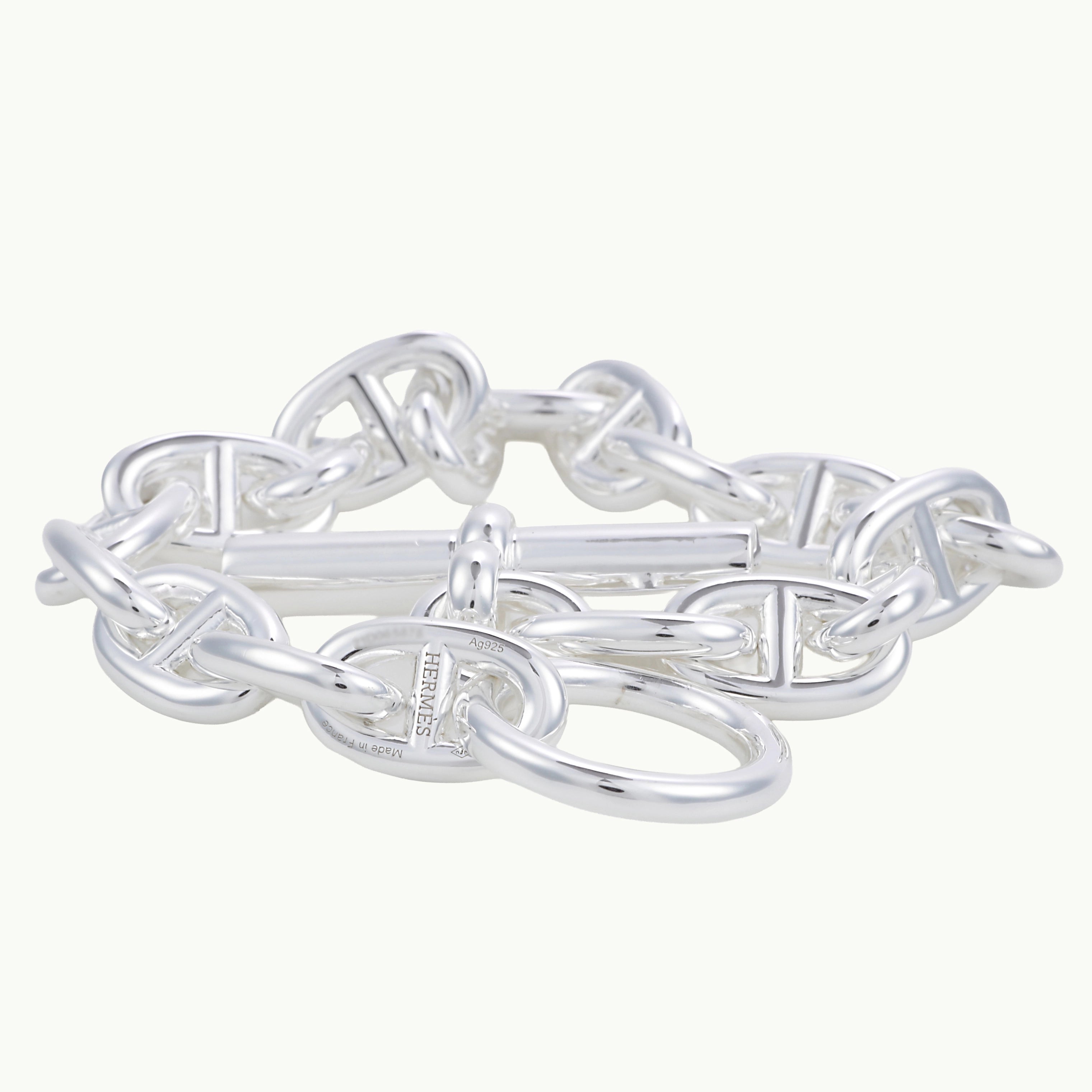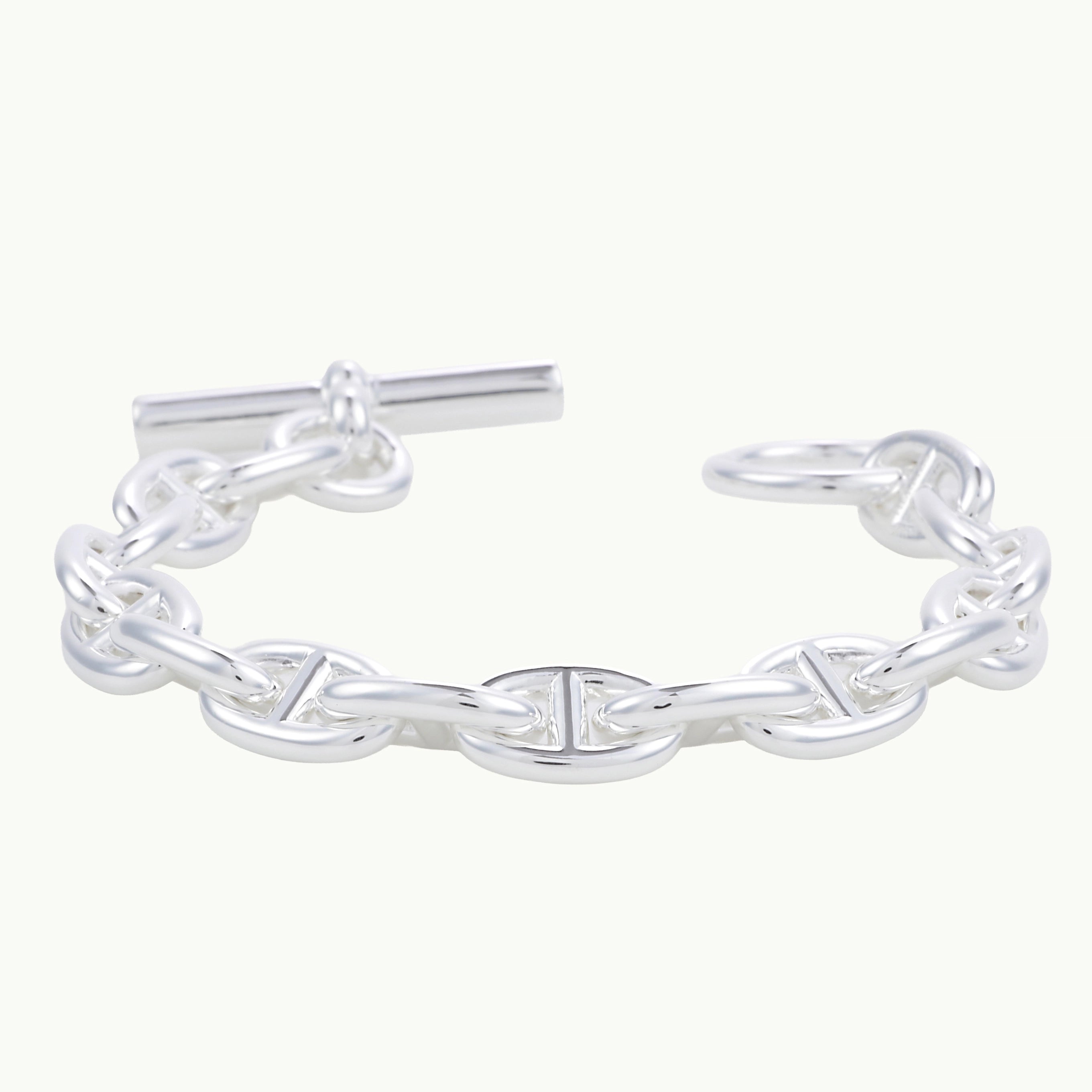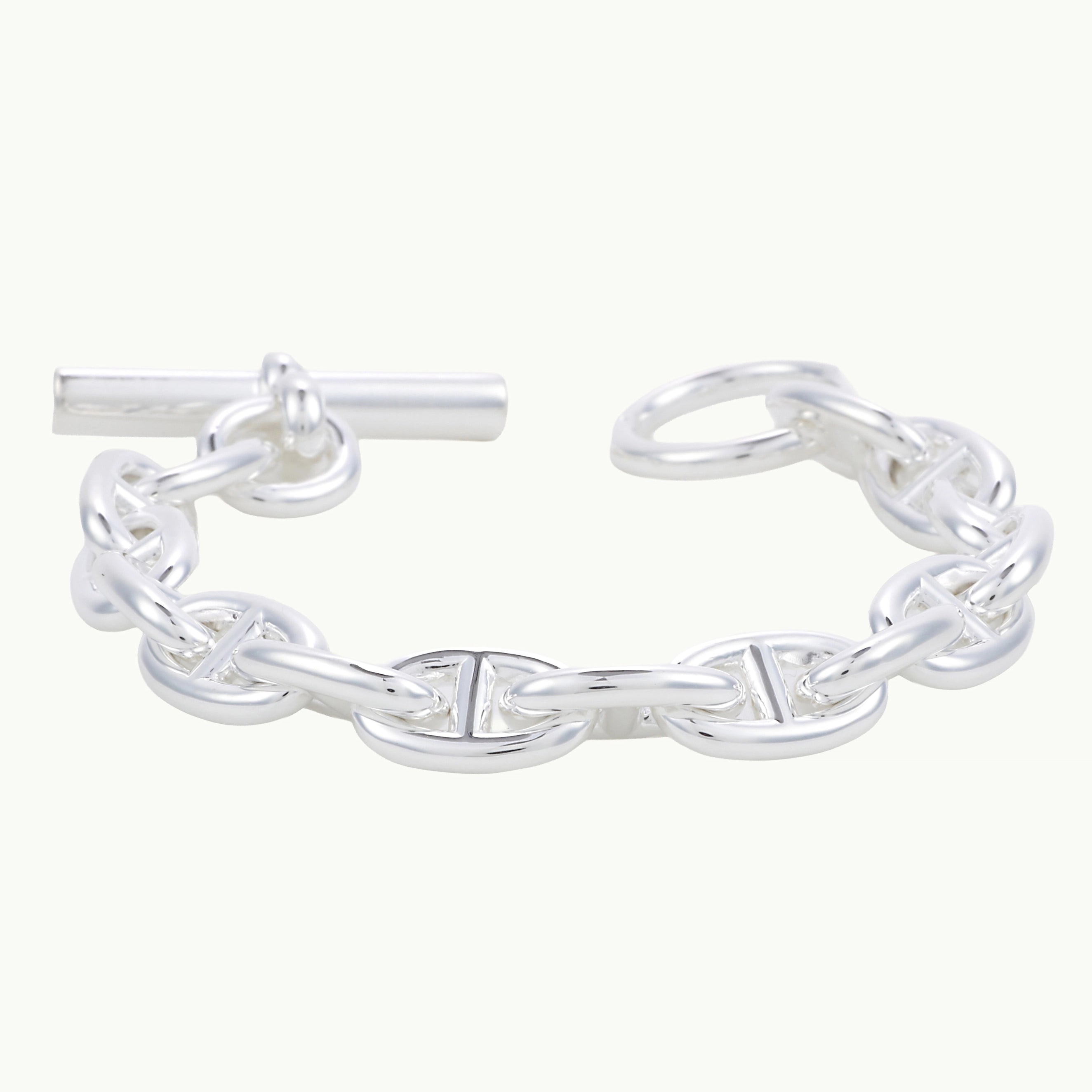本品はそのシリーズの中でも2番目に小さい「PMサイズ」。華奢すぎず、程よいボリューム感で、ジェンダーを問わず着用できる絶妙なバランスが魅力です。エルメスが誇る職人の手仕事により、各リンクが美しく繋がれたチェーンは、静かな中にも確かな存在感を放ち、シンプルな装いを格上げしてくれます。