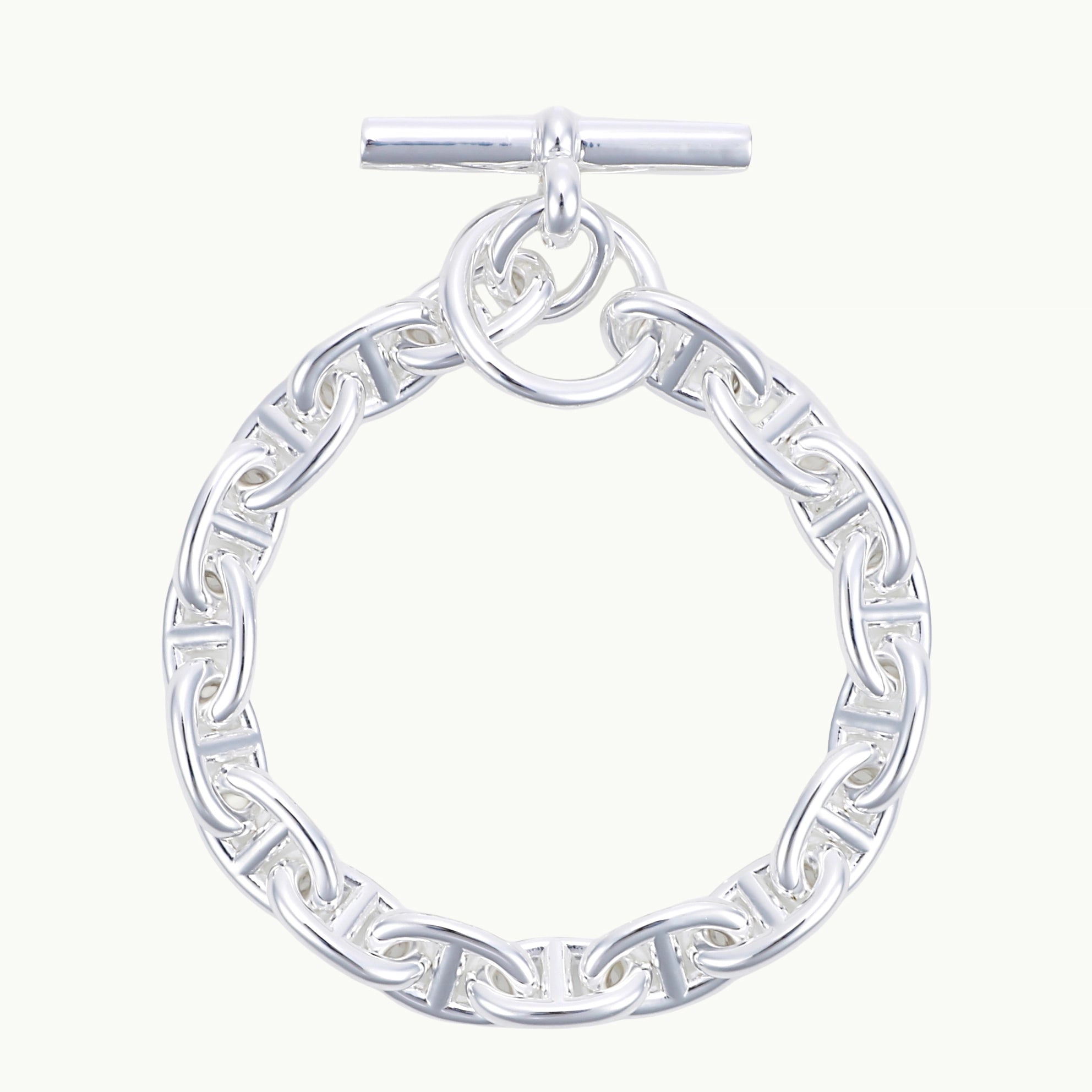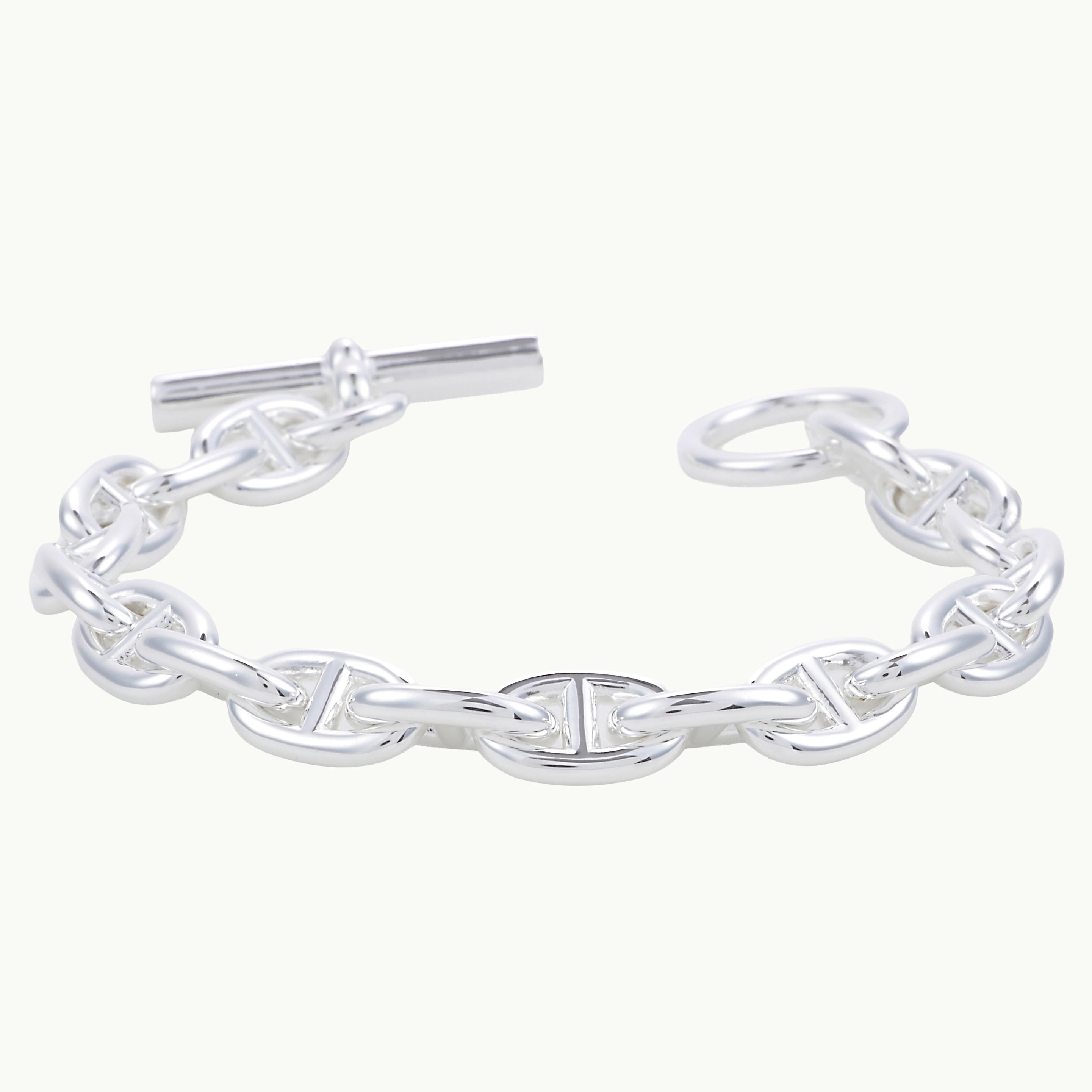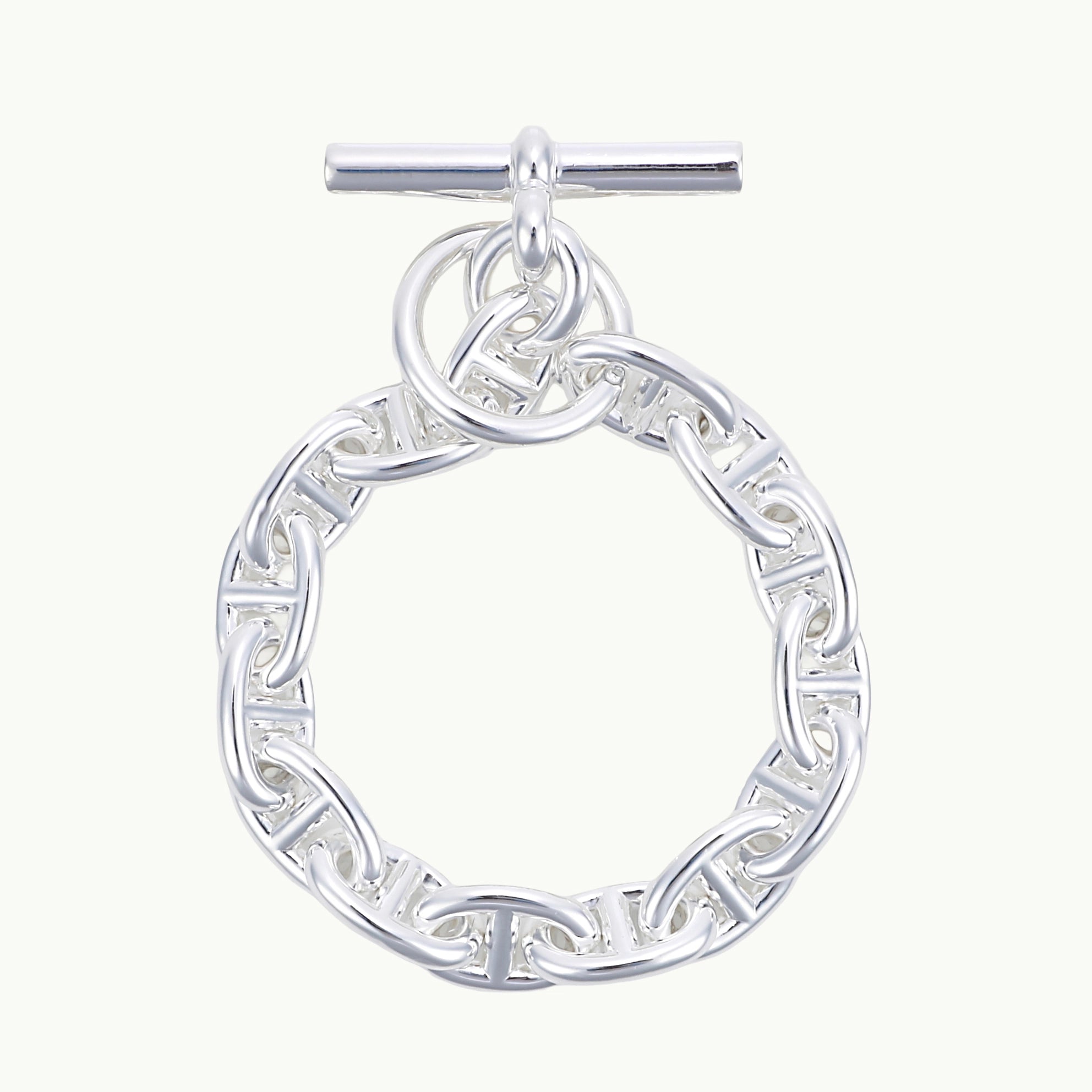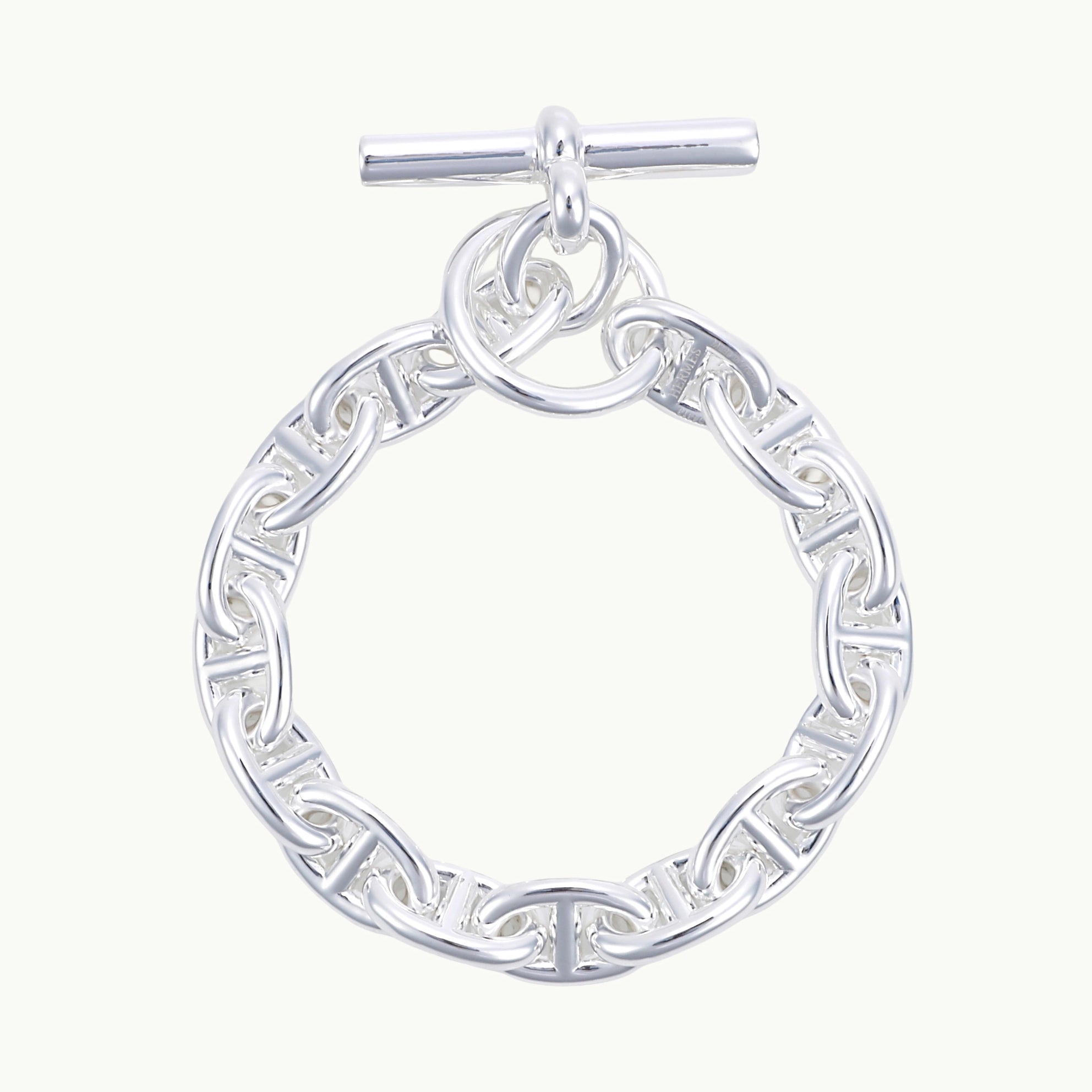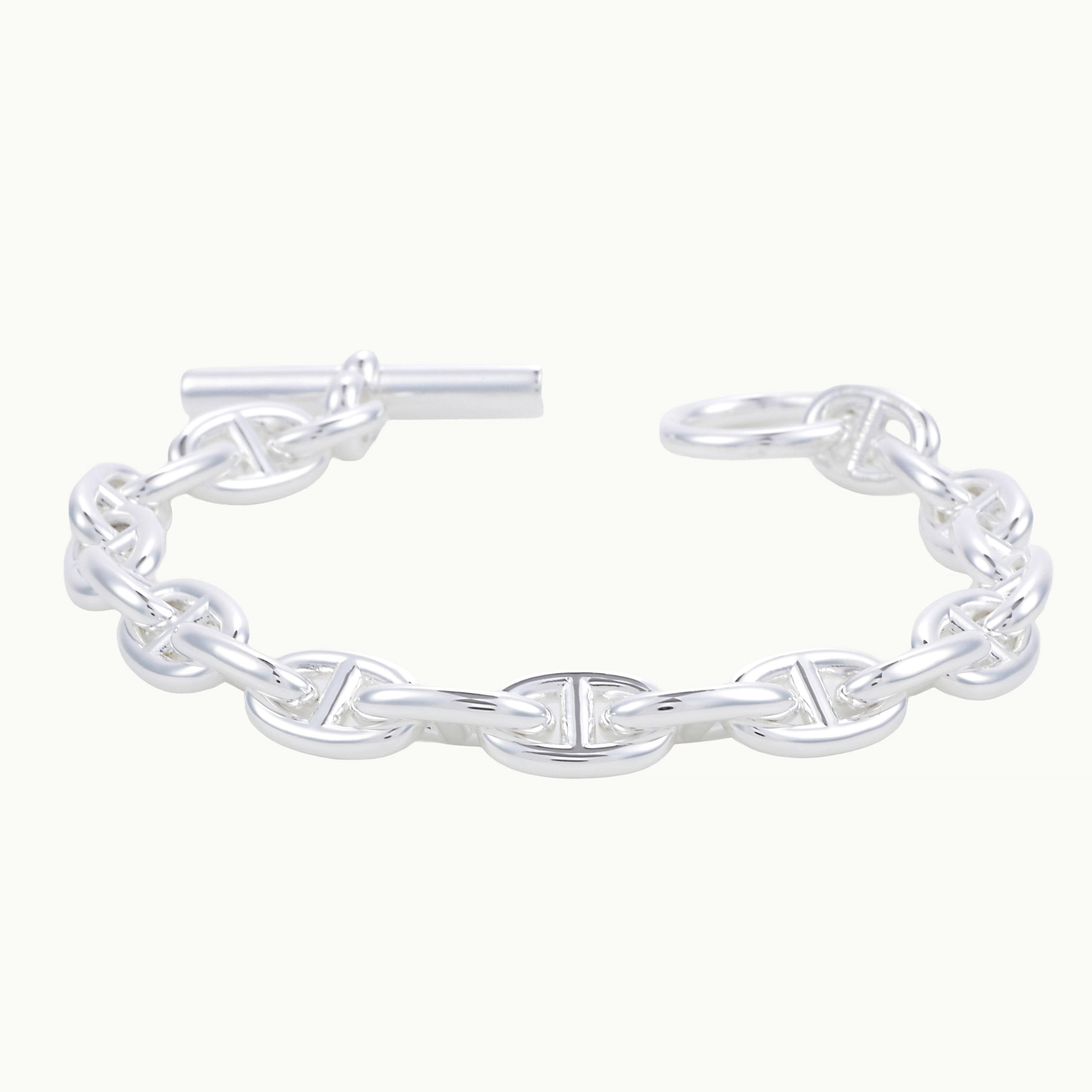 本品はそのシリーズの中でも2番目に小さい「PMサイズ」。華奢すぎず、程よいボリューム感で、ジェンダーを問わず着用できる絶妙なバランスが魅力です。エルメスが誇る職人の手仕事により、各リンクが美しく繋がれたチェーンは、静かな中にも確かな存在感を放ち、シンプルな装いを格上げしてくれます。