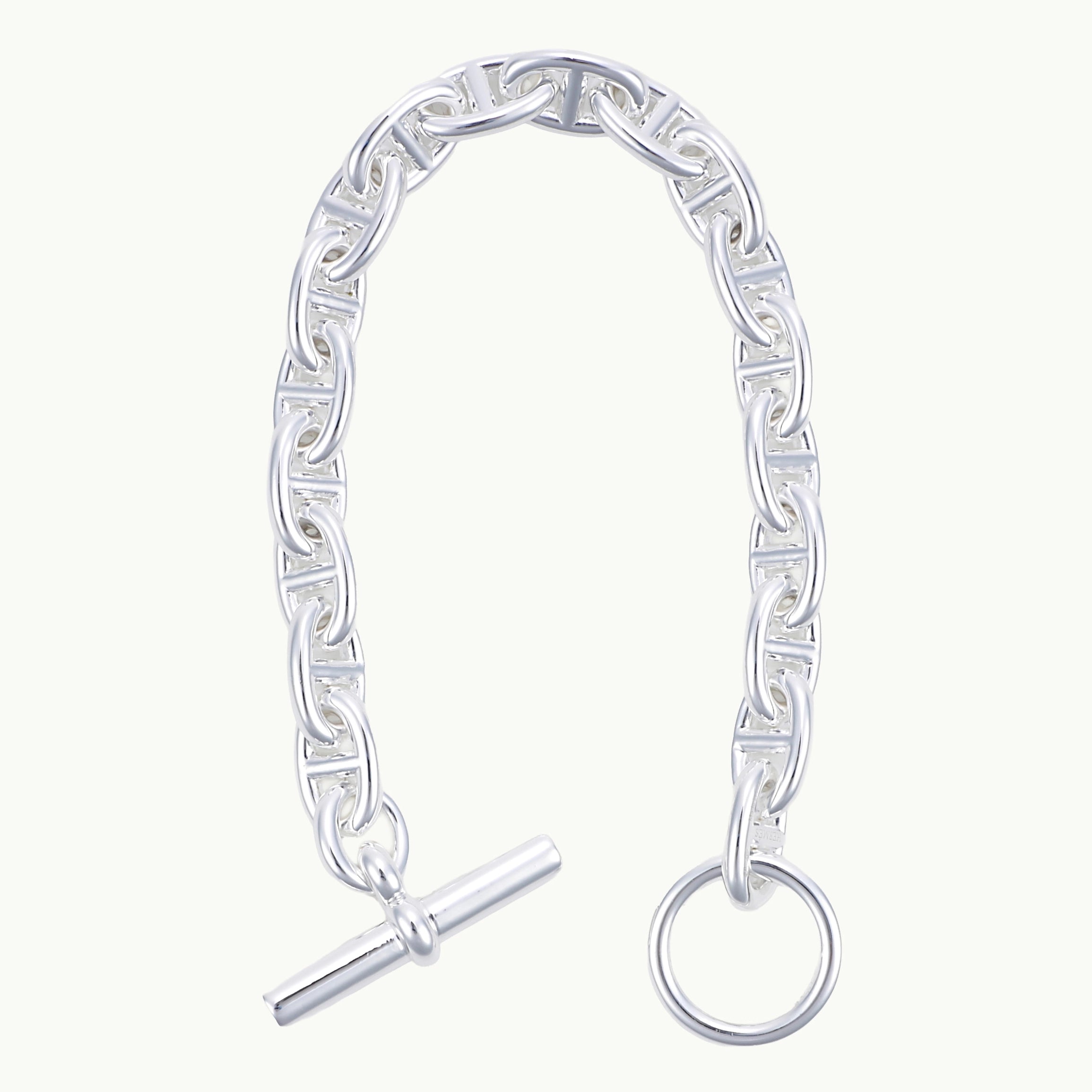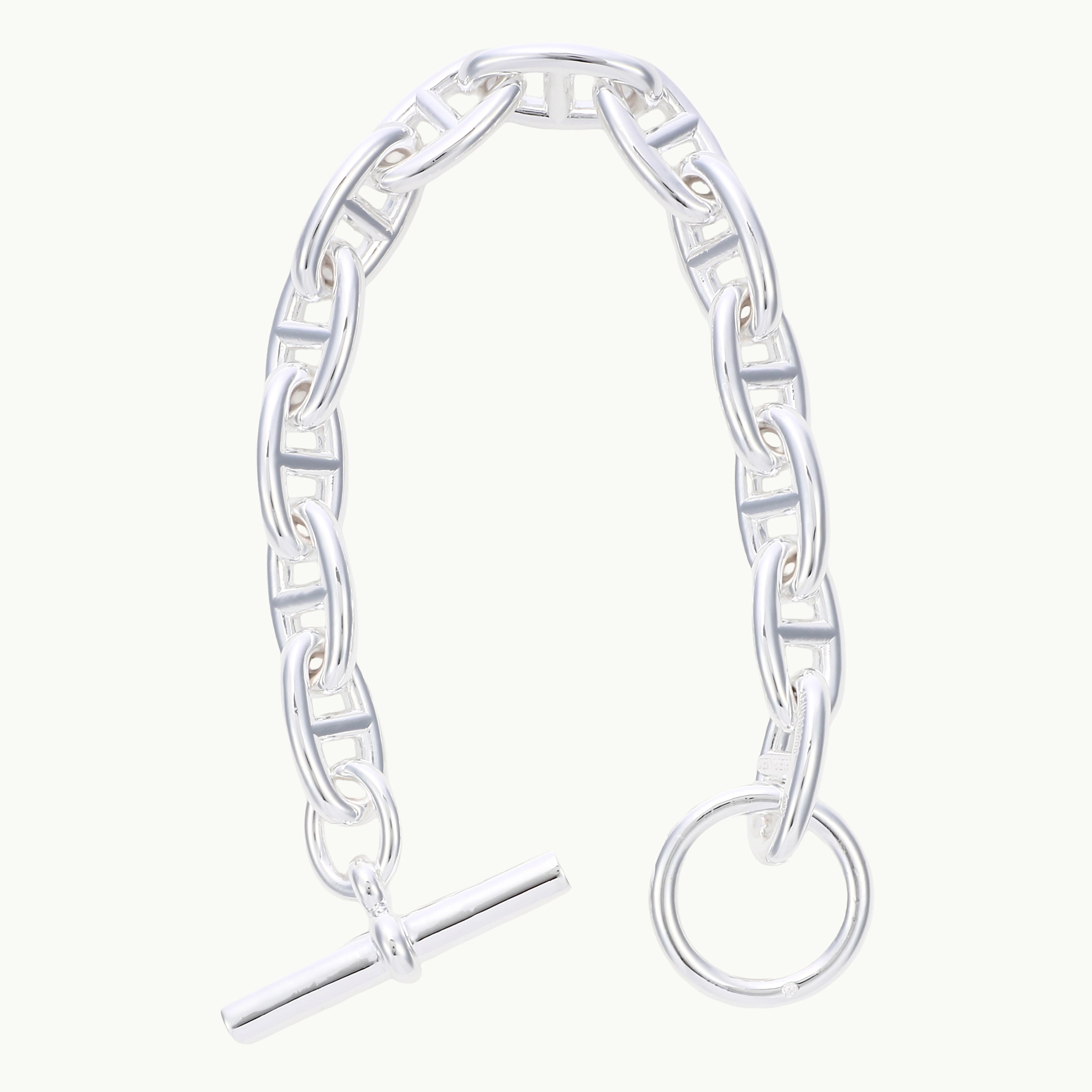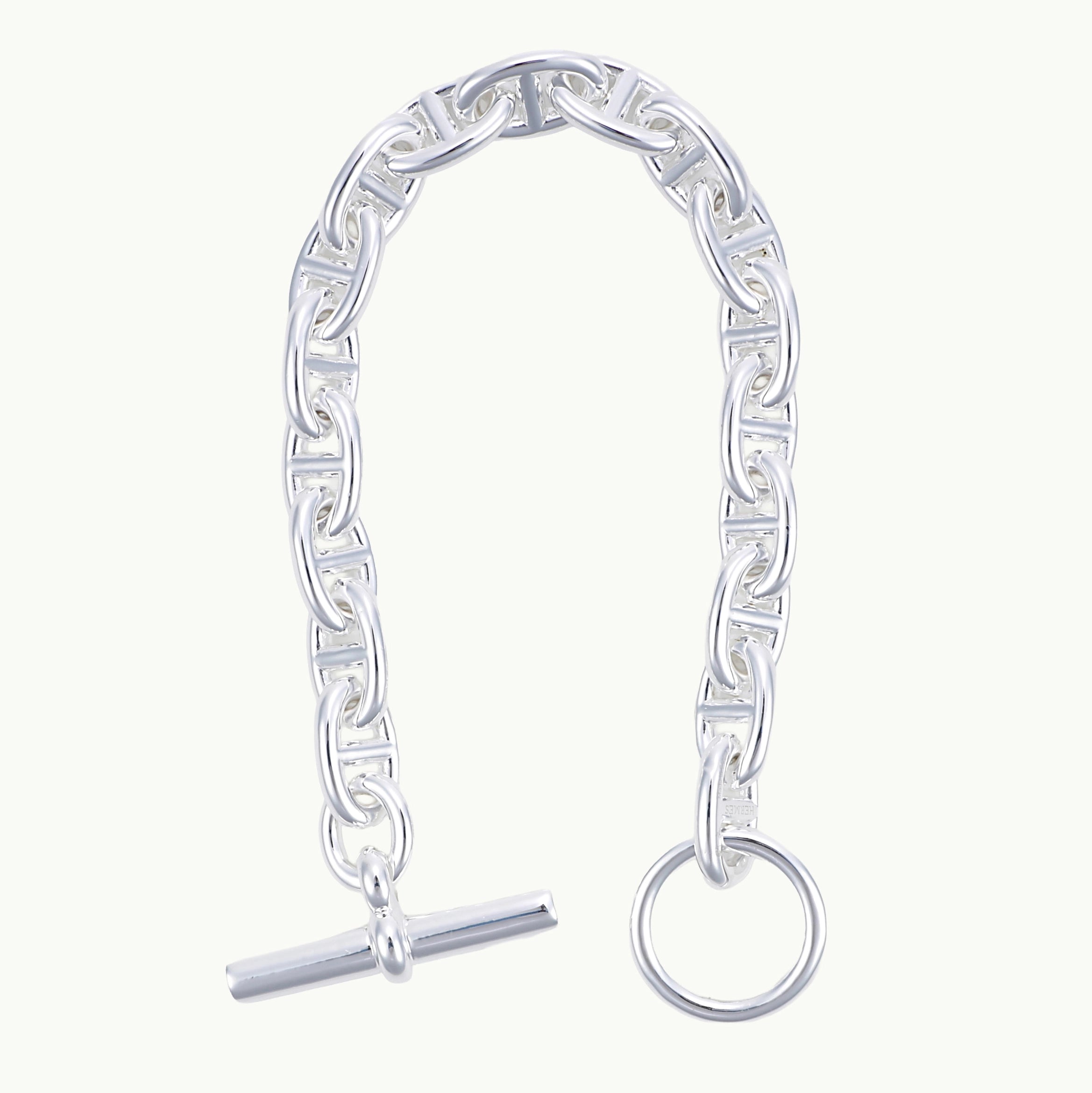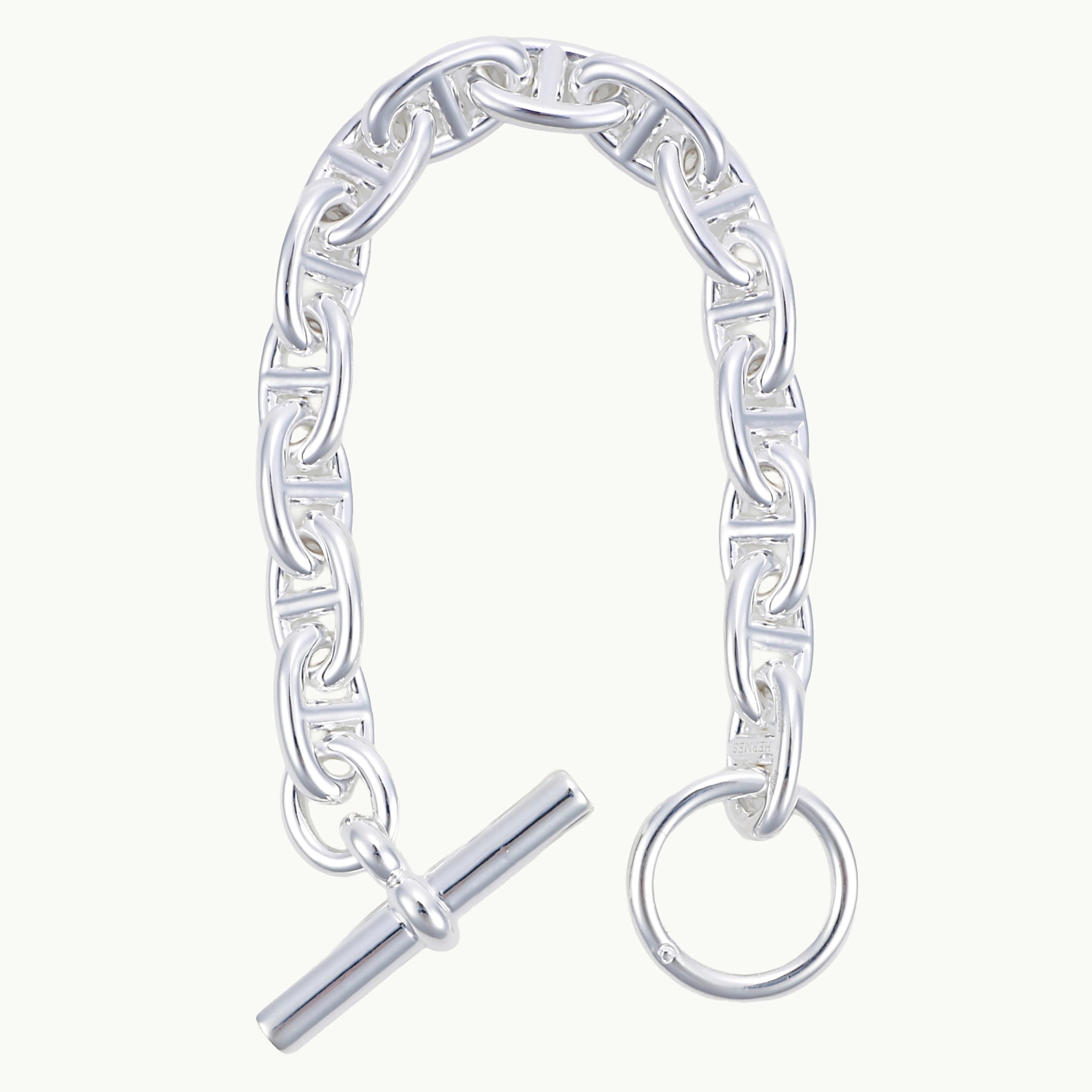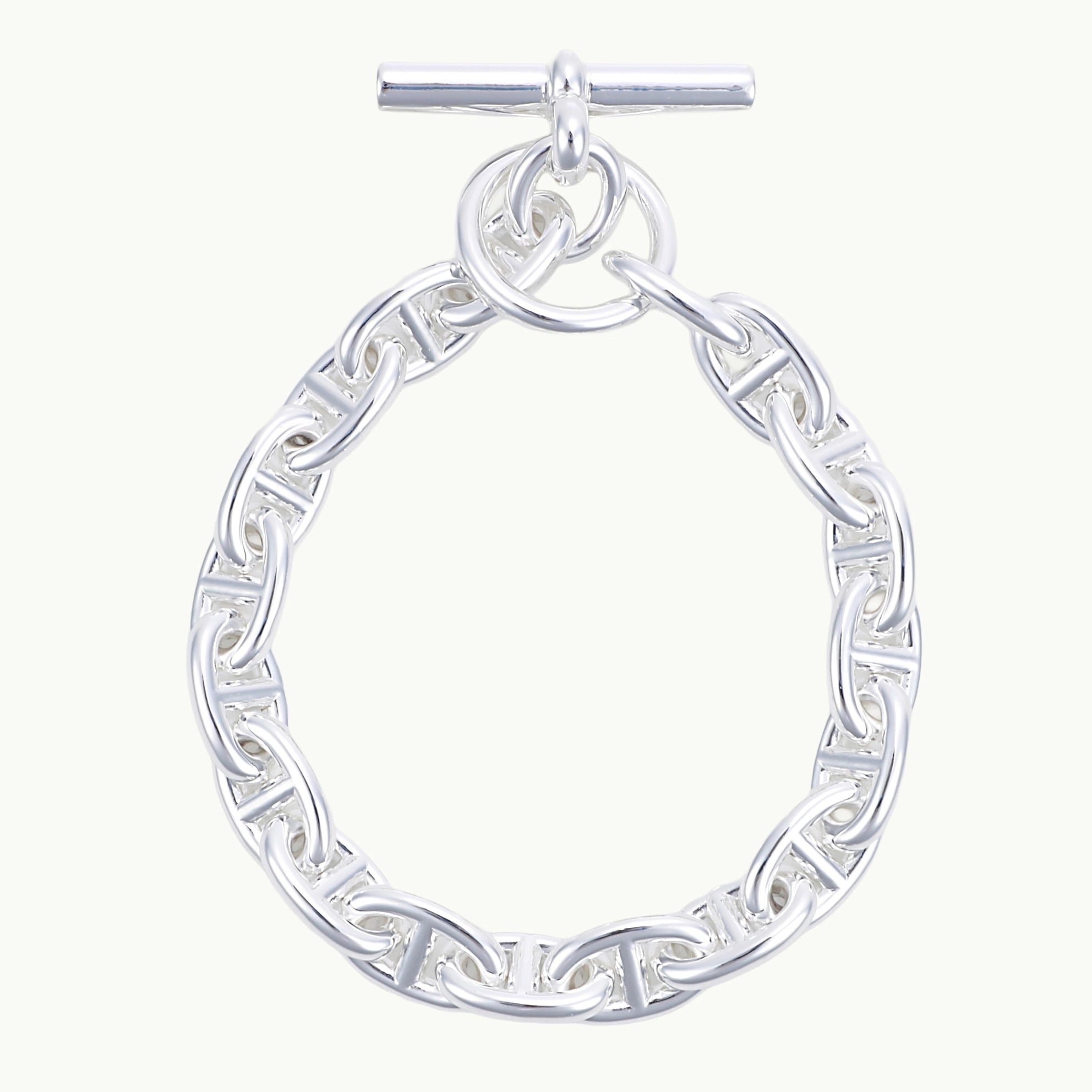 本品はそのシリーズの中でも2番目に小さい「PMサイズ」。華奢すぎず、程よいボリューム感で、ジェンダーを問わず着用できる絶妙なバランスが魅力です。エルメスが誇る職人の手仕事により、各リンクが美しく繋がれたチェーンは、静かな中にも確かな存在感を放ち、シンプルな装いを格上げしてくれます。