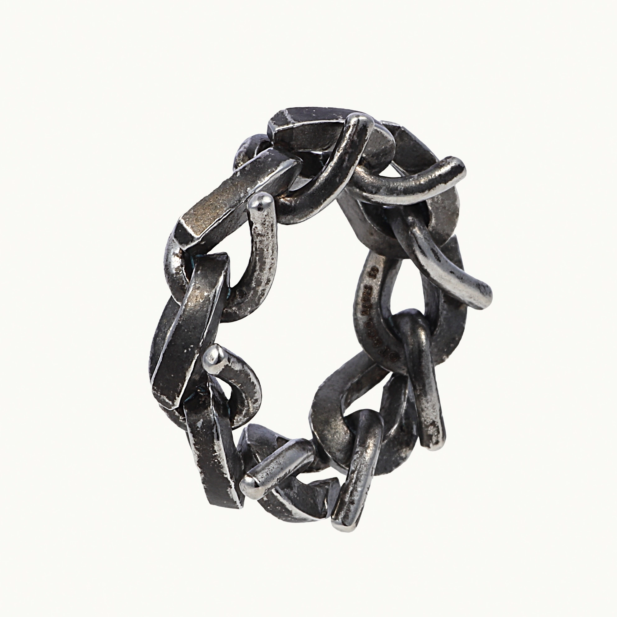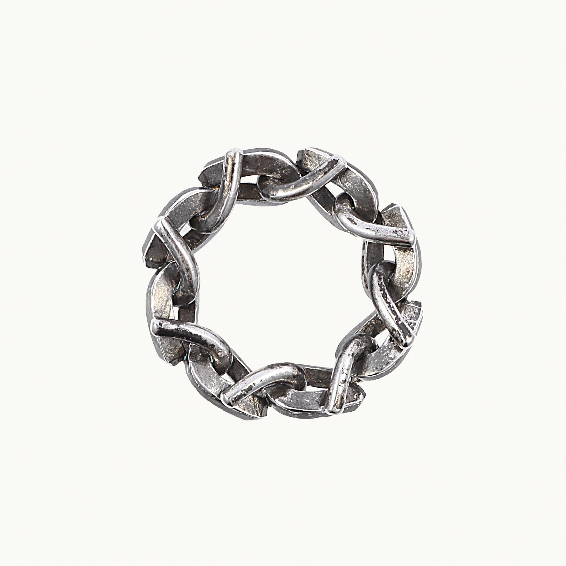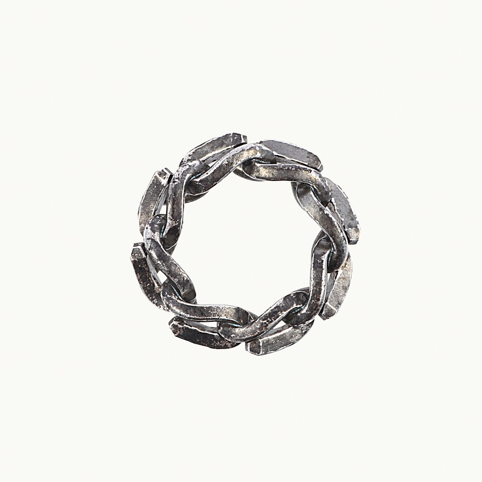 こちらは、リンクモチーフを大胆に造形した「フォージ リンク リング」のいぶし仕上げモデル。鏡面の輝きが特徴のハイポリッシュとは対照的に、いぶし加工を施すことで、シルバーの陰影や奥行きが際立ち、重厚でクラフト感あふれる表情を生み出しています。まるで時を経たアーティファクトのように、アンティークライクな落ち着きが魅力です。
