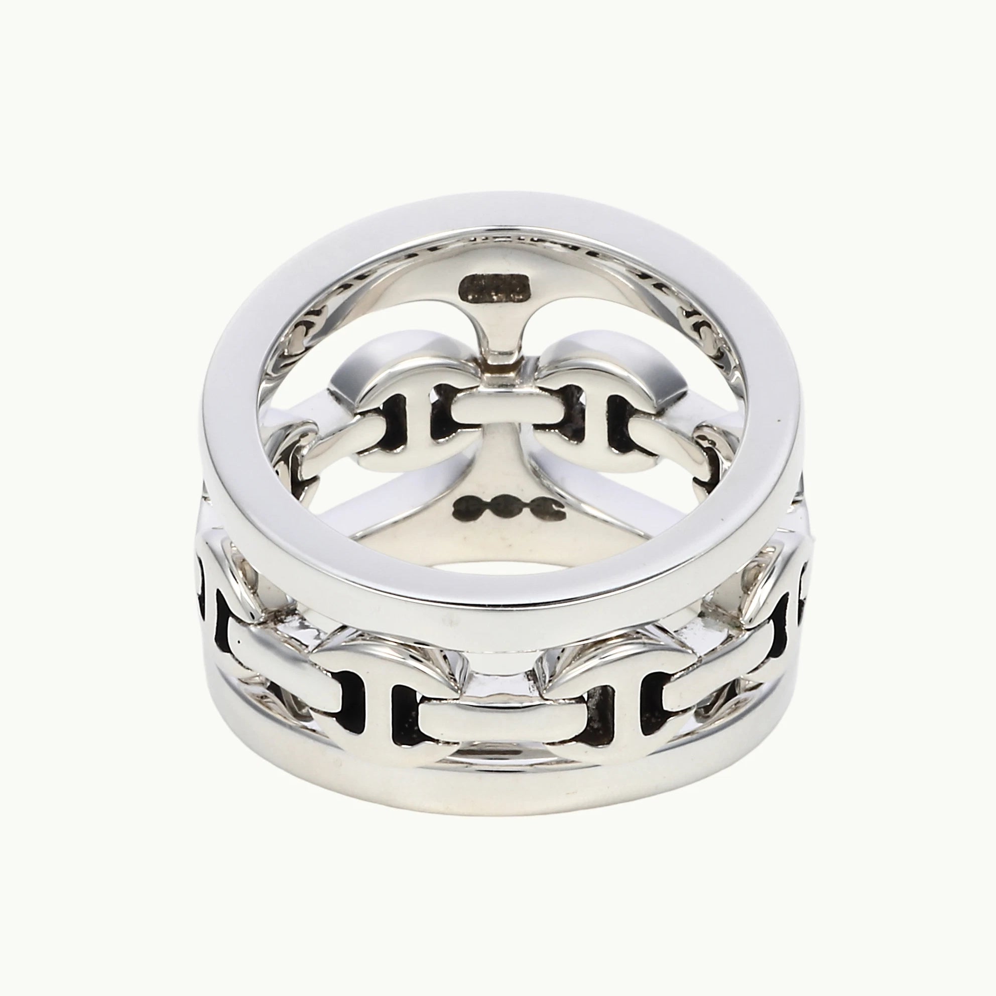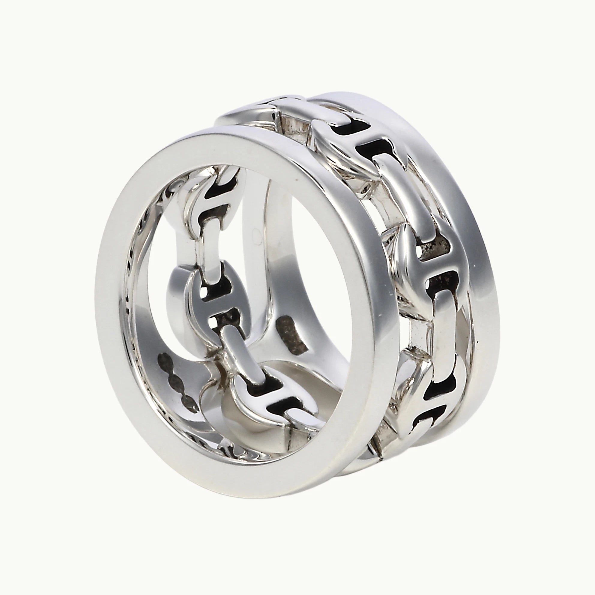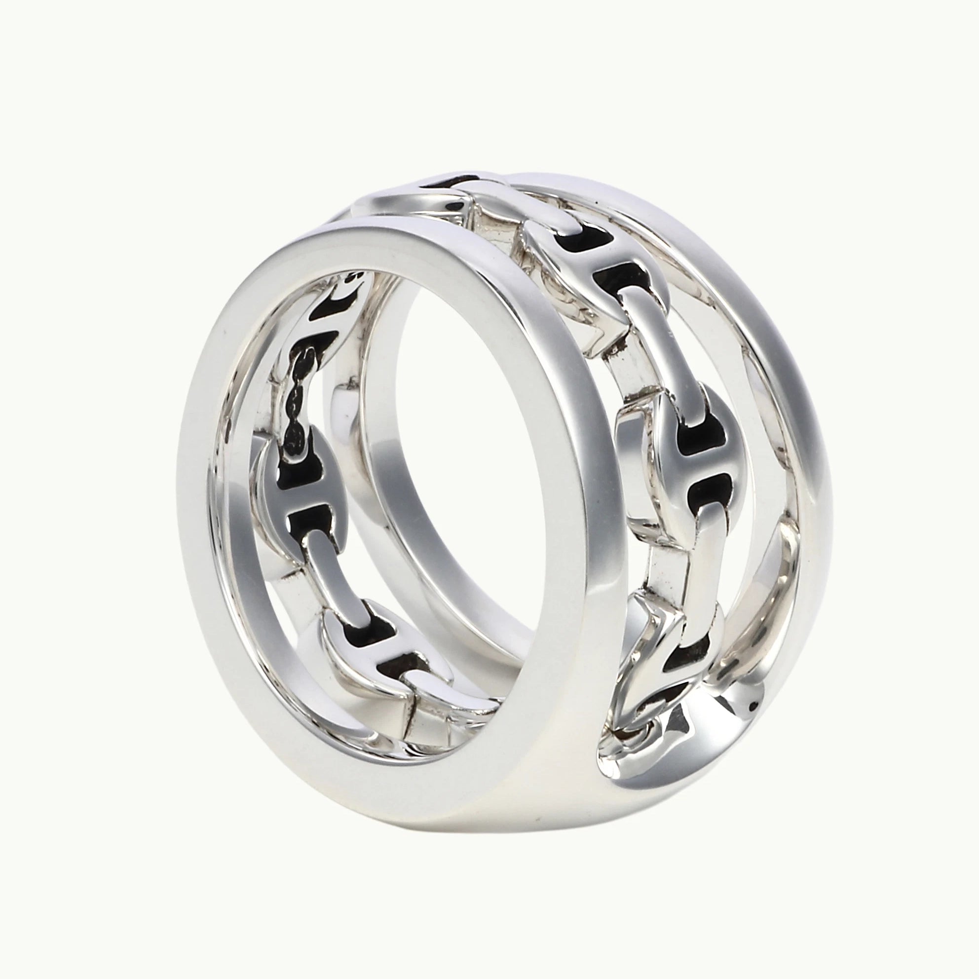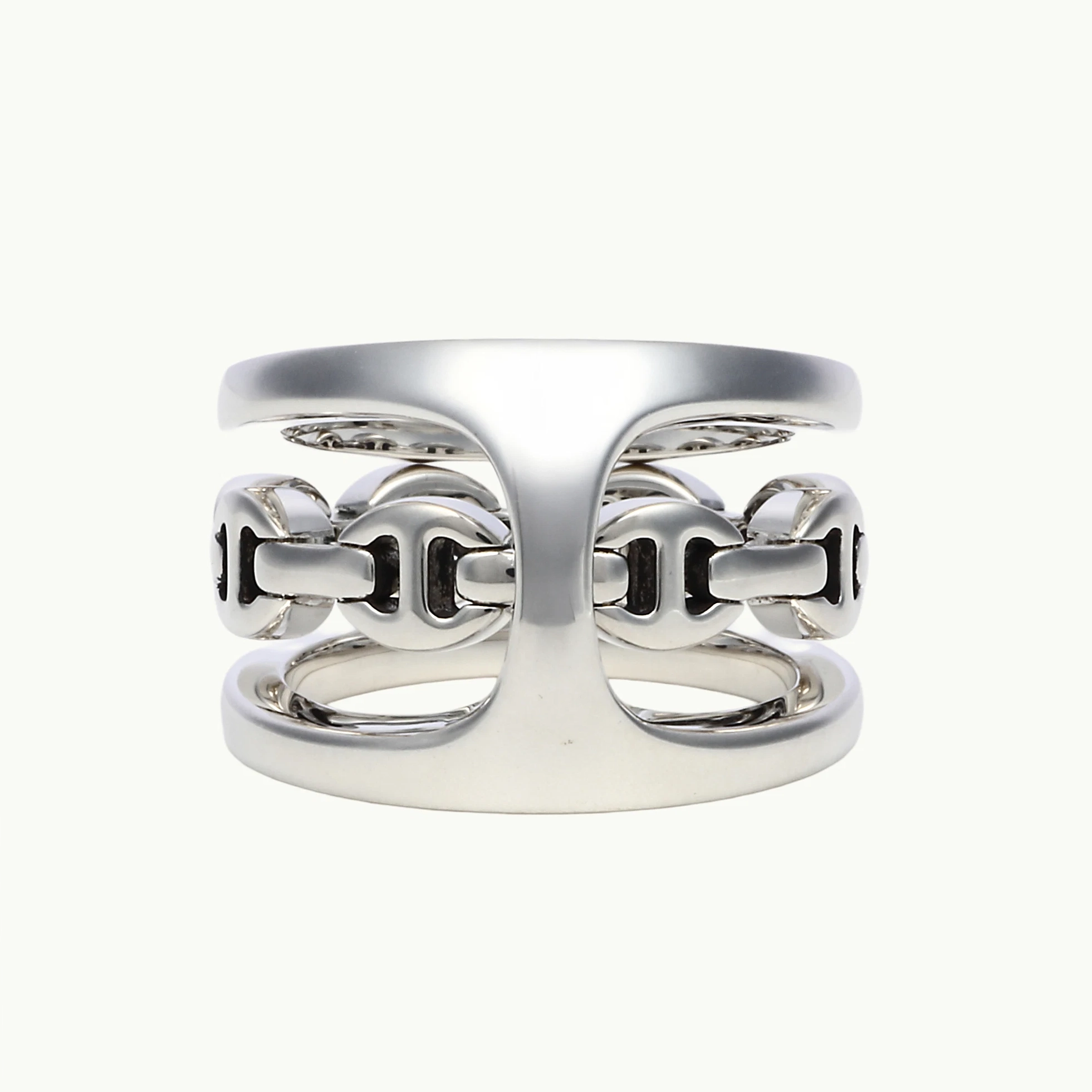 「HOORSENBUHS」を象徴する2つの意匠、TRI-LINKとPHANTOMを一体化させた“PHANTOM CLIQUE”。 指に沿って延びるファントムの流線と、トライリンクの重なりがカチッと噛み合い、ひとつの造形として成立します。シーンによっては分けて単体で着けられるのもこのモデルならでは。重厚さはありつつ、面取りの効いた仕上げで指あたりは滑らかです。