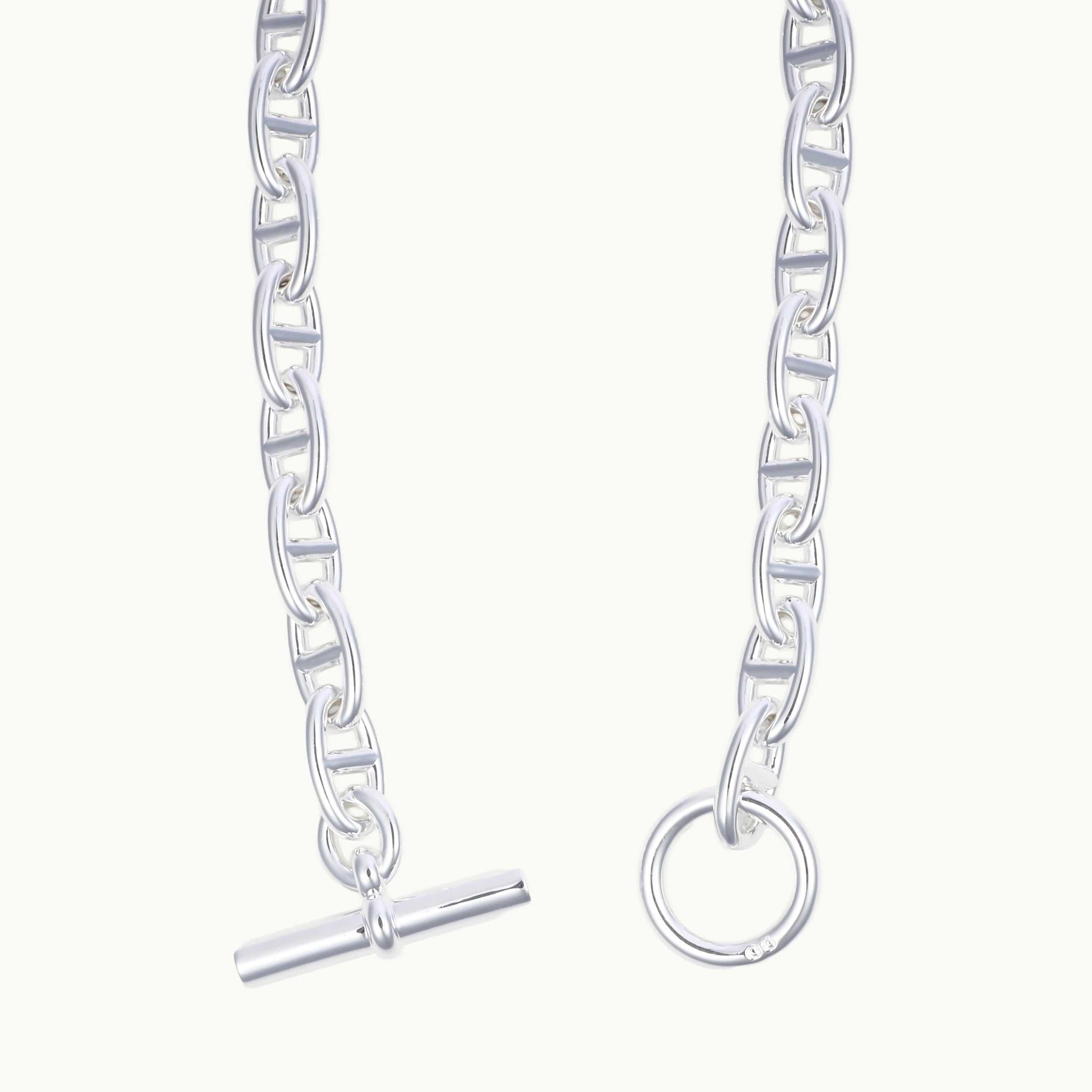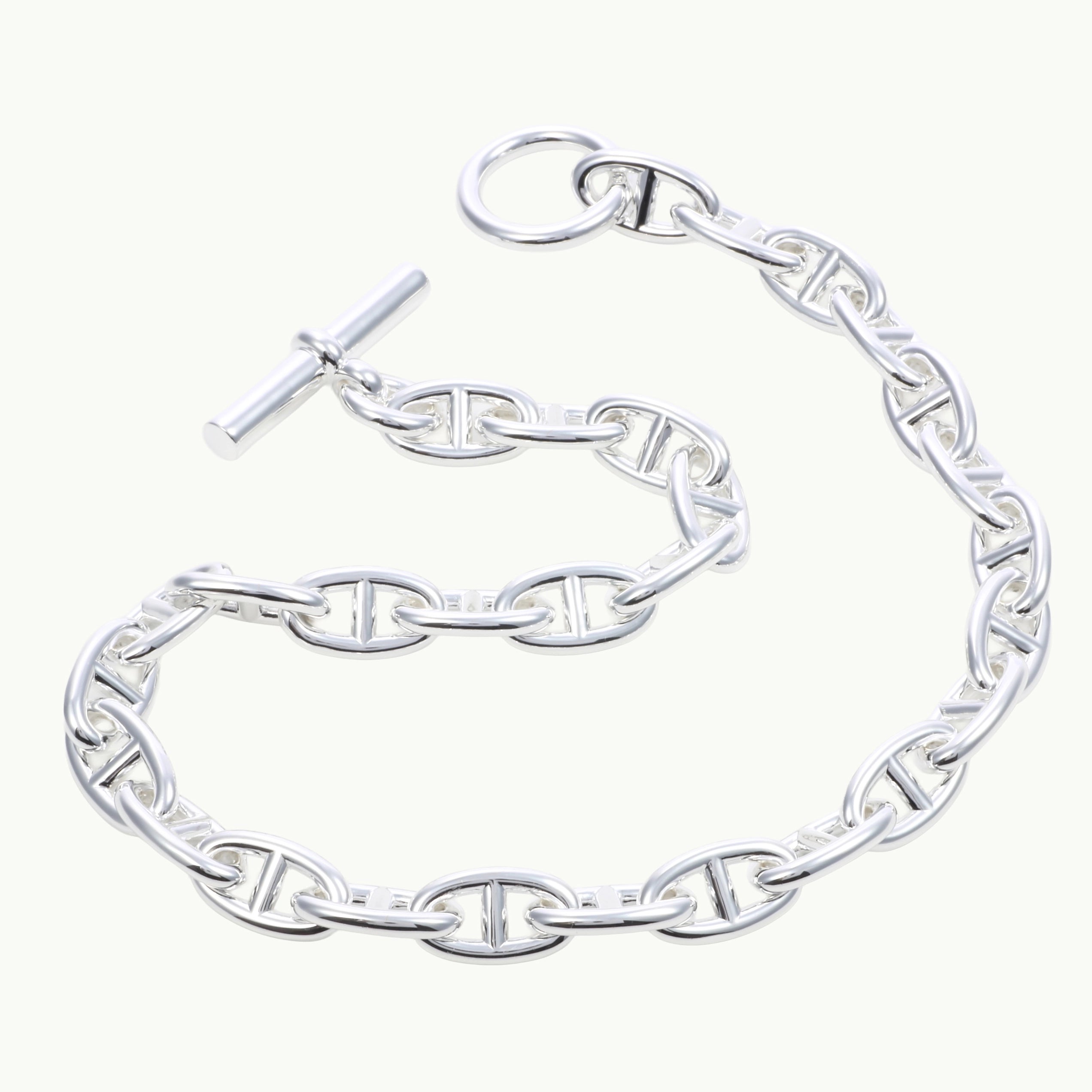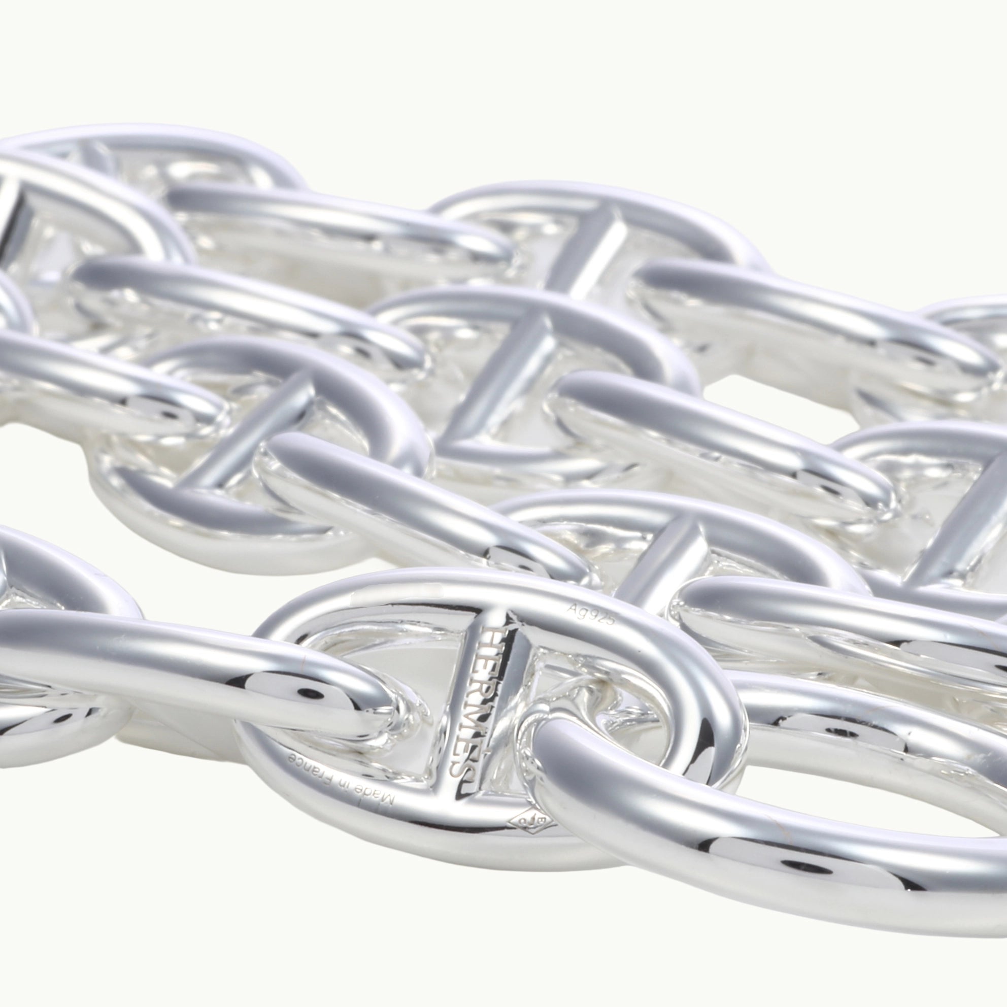 こちらは、その中でも存在感を放つ「GM(グランモデル)」サイズのシルバーネックレス。大胆なコマが織りなすリズムあるチェーンは、エルメスが誇る職人技によってひとつひとつ丁寧に仕上げられ、シンプルでありながら力強いエレガンスを湛えています。カジュアルからドレッシーまで幅広くマッチし、装いにタイムレスな洗練を添えてくれる一本です。